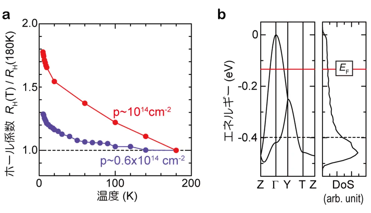 a. いくつかの正孔数密度pにおける実測されたホール係数RHの温度変化。b. C8-DNBDTの価電子バンド(左)と状態密度(右)の計算結果。結晶中の正孔キャリアは量子力学の法則によって、ある決まったエネルギー(縦軸)と運動量(横軸)の組み合わせ状態しかとれない。価電子バンドはこの関係を表したものである。そして状態密度は、正孔がある決まったエネルギー(縦軸)をとった時に取りうる運動量状態の総数(横軸)を図示したものである。正孔数密度p~1014 cm-2の場合のフェルミエネルギーEFの位置を赤横線で示す。正孔は価電子バンドの頂上からEFまで詰まっていて全体の約1/8に相当する。比較のためハーフフィリングの場合のEFの位置を破線で示す。