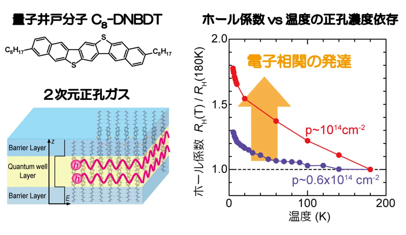 一般にバンド幅(図2b参照)に比べて、クーロン斥力が大きいほど、電子相関効果の発現に有利になります。また、遮蔽効果が弱いほど、離れた正孔間にも大きなクーロン斥力が働くことになるので、正孔数密度がハーフフィリング系に比べて低くても電子相関効果が発現しやすくなると期待されます。C8-DNBDTをはじめとする有機半導体は、銅酸化物などに比べて、狭いバンド幅と弱いトーマス・フェルミ遮蔽を有するので、電子相関を観測するための理想的な物質であると考えられます。そこで本研究では、電子相関効果の発現を観測するために有機半導体C8-DNBDTに更なる高密度正孔ドーピングを行い、そのホール効果[用語6]を測定しました。通常、正孔に注入された半導体や金属においてホール係数RHの値は正孔数密度pと電気素量eの間に(eRH)-1 = pの関係があり、温度変化しません。ところが正孔数密度が前例のない高密度1014 cm-2に近づくにつれてRHの温度変化が低温ほど顕著になっていく様子を観測しました(図2a)。理論解析の結果、有機半導体の弱い遮蔽効果に由来する長距離の正孔間クーロン斥力が電荷秩序相を誘起するために、ホール係数に温度変化を生じさせる可能性があることを見い出しました。すなわち、正孔ドーピングによって有機半導体中の2次元正孔ガスに強い電子相関が発達していく様子を世界で初めて観測しました。有機半導体C8-DNBDT薄膜はアルキル鎖(C8)部分がエネルギー障壁となってDNBDT部分に2次元正孔ガスが存在する量子井戸構造と見なせます。アルキル鎖が外部ドーパント(図1bのアニオン)層の無秩序ポテンシャルから2次元正孔ガスを守り、高正孔密度でもクリーンな電子系を維持できます(図1b)。驚くべきことにp~1014 cm-2の場合でも正孔はバンドの1/8程度(4分子あたり正孔1個程度)しか詰まっていないにも関わらず(図2b)、強い電子相関効果が現れることが分かりました。電子相関が引き起こす電荷秩序や高温超伝導のようなエキゾチックな電子相は主にハーフフィリング近傍で発現するというこれまでの常識を覆す可能性のある研究成果です。