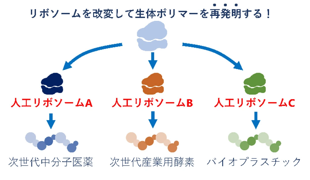 リボソームとは、遺伝コードに従って20種類のアミノ酸をつなげてタンパク質を作る分子機械です。この分子機械を改変し、多様で自然界にはない新しい材料(非天然モノマー)を使ってタンパク質を作れるようになれば、人類が利用可能なペプチド・タンパク質の多様性を大幅に拡張できるため、優れた中分子医薬や産業用酵素の創出が可能になると期待されます。