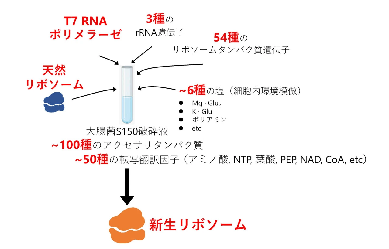 • 「生体内環境を試験管内で模倣する」ことを指針に、それら200種の因子を適切な環境で組み合わせることで、リボソーム生合成の試験管内再構成[用語2]に成功
