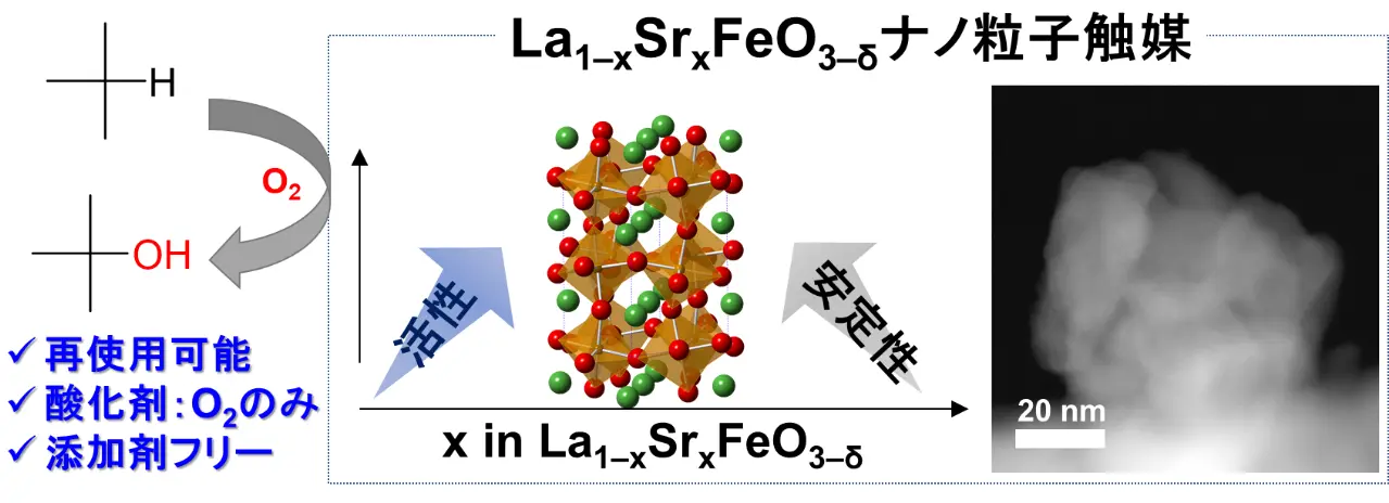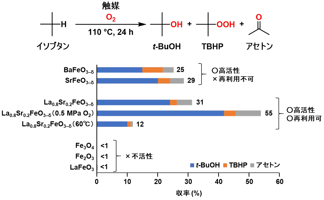 これらの背景から、研究チームは低級アルカンであるイソブタンからtert-ブタノール(t-BuOH)[用語2]への酸化変換に対する触媒として、鉄の酸化数を制御したペロブスカイト酸化物[用語3]La1–xSrxFeO3–δの効果を評価しました。その結果、このペロブスカイト酸化物が、酸素分子のみを酸化剤として用いる高活性の触媒として機能することを発見しました。さらに、従来の均一系触媒よりも低い反応温度で、高いアルコール生成能力を示す、安定かつ再利用可能な固体触媒であることも明らかになりました。