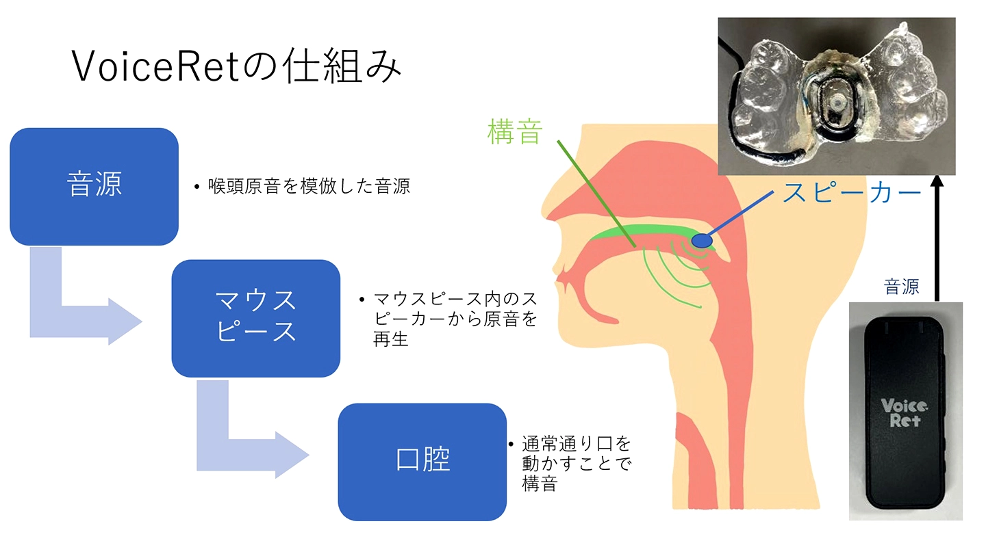 喉頭・声帯を摘出し、声を失った方が再び会話できるようにするための「代替発声」には、習得の難しさや音質、適応制限などの壁がありました。 そこで、摂食嚥下リハビリテーション学分野および東京科学大学病院 摂食嚥下リハビリテーション科の歯科医師が中心となり、マウスピース型人工喉頭「Voice Retriever」の開発に着手しました。本製品は、2021年に旧東京医科歯科大学で実施されたクラウドファンディングプロジェクトにより研究開発費を調達し、実証試験を行い、それが製品化に大きく寄与したものです。