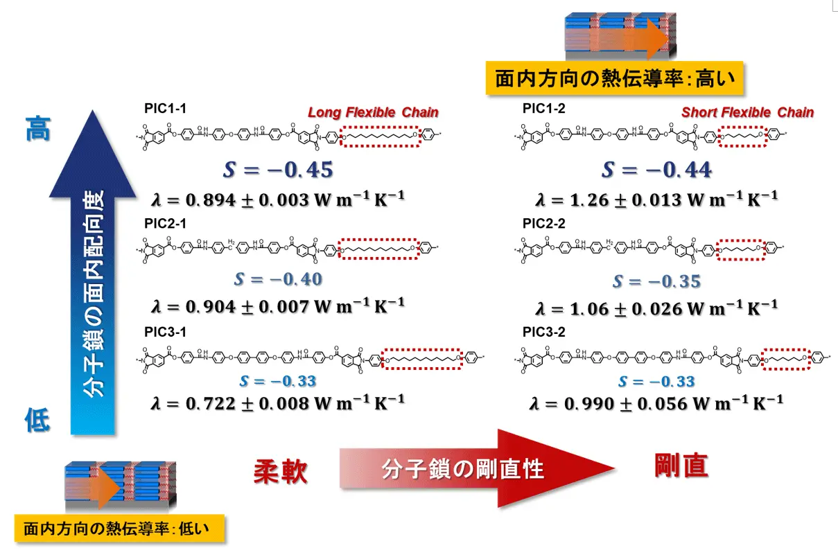 - 一般的なポリイミドと比べて極めて高い熱伝導率を示すポリイミドを合成