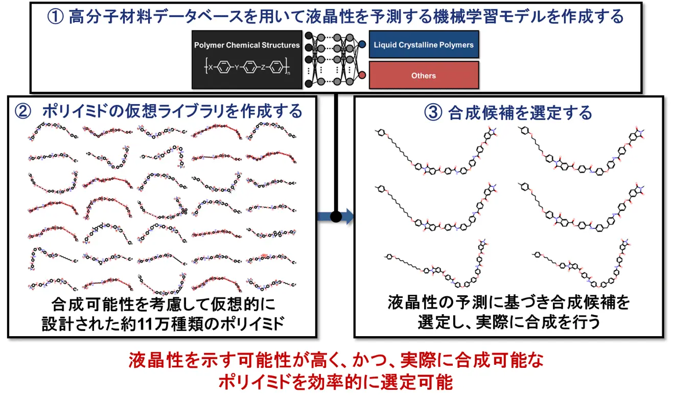 - 高分子の液晶性を予測する機械学習モデルで設計・合成した新規液晶性ポリイミドで、分子配列・配向の変化と熱伝導率の向上を実験的に確認