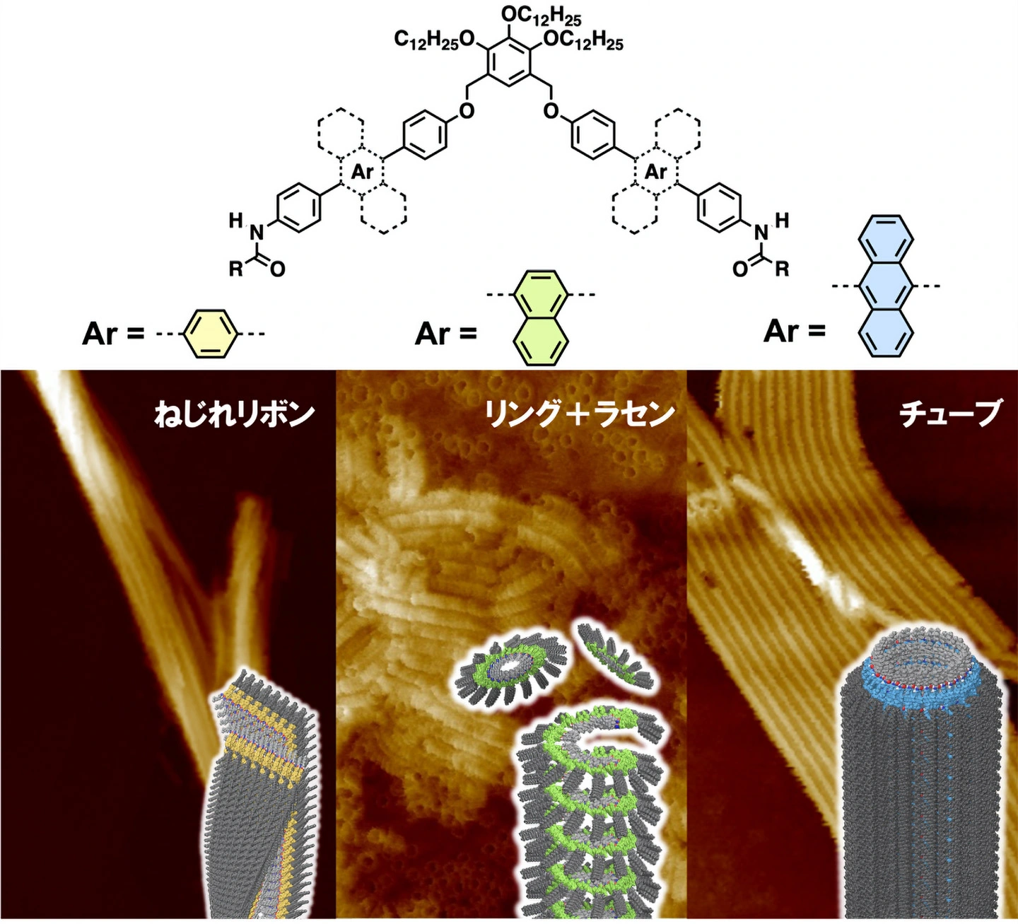 研究チームは、3種類の折りたたみ可能な複数のπ電子系部位分子を合成しました。これらの分子は、発光やエネルギー輸送に関わるπ電子系部位の大きさが、ベンゼン、ナフタレン、アントラセンと段階的に大きくなるように設計されています。その結果、π電子系部位がより大きくなるにつれて、分子の折りたたみ方が変化し、それに伴って自己組織化構造が大きく変化することが明らかになりました。具体的には、ベンゼンではねじれたリボン状の紐(ポリマー)、ナフタレンではリング状とらせん状のポリマー、そしてアントラセンは中が空洞のチューブ構造が形成されることが、原子間力顕微鏡[用語4]および透過型電子顕微鏡[用語5]観察により明らかにされました。これらの構造は、ポリマーを曲げると輪やらせん、円筒になるように、分子が連結して形成されるポリマーが、分子の折りたたみ構造に応じて曲がり、その曲がり方の違いが集合体の形として現れたものです。