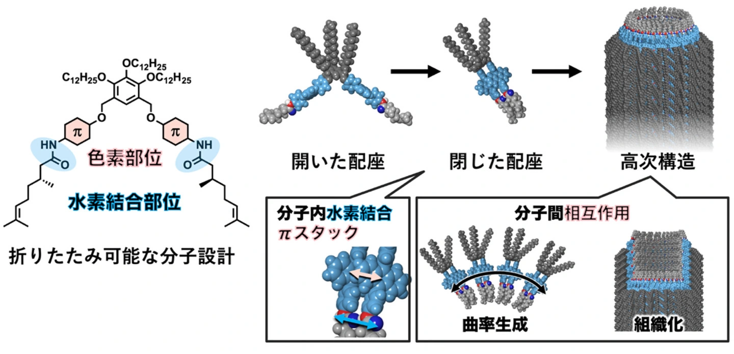 東京科学大学(Science Tokyo) 物質理工学院 材料系のMartin Vacha(マーティン・バッハ)教授は、千葉大学 国際高等研究基幹の矢貝史樹教授、大阪大学 大学院基礎工学研究科の五月女光助教、北里大学の渡辺豪教授、Keele大学のMartin J. Hollamby 講師、青山学院大学、物質・材料研究機構(NIMS)との研究で、タンパク質が生体内で行っている「折りたたみ」を介した自己集合過程をヒントに、有機分子を使って「折りたたみ」を介した自己集合を起こす仕組みを調査しました。その結果、立体的に複雑な構造を持つ発光性分子が、自発的な折りたたみによって適切なメゾスコピック形態[用語1]へと変化し、最終的には中が空洞のチューブ構造へと組織化することを発見しました。さらにその詳細な構造や機能を探索したところ、このチューブでは励起エネルギー[用語2]が軸方向だけでなく周囲方向にも高速で移動することが確認され、励起エネルギーを効率よく運ぶ新しい材料設計指針が示されました。