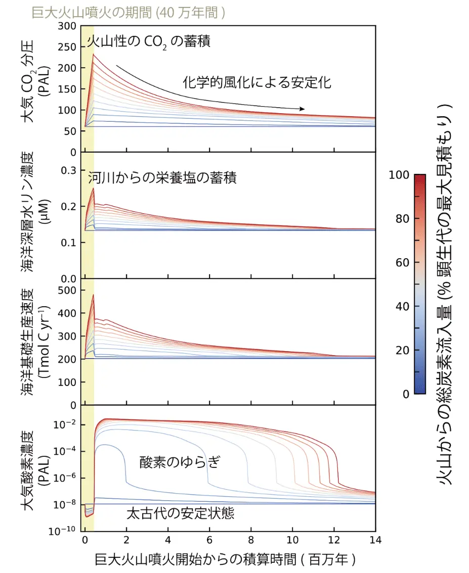 得られた結果を図2に示します。巨大火山噴火の発生に伴い多量の二酸化炭素が大気中に放出され、大気二酸化炭素濃度が急激に上昇したことが示されました。すると、大陸地殻の化学的風化[用語5]の速度が増大し、岩石中の成分が河川を通じて海洋へと多量に流出します。とりわけ、当時の海洋の基礎生産を担っていた光合成生物の活動を律速する必須元素(リンなど)の供給速度も上昇するため、酸素発生型光合成生物であるシアノバクテリア[用語6]の基礎生産がそれまでの倍以上に上昇し、大気酸素濃度が数百万年から一千万年にわたって上昇することが示されました。この期間の長さは地質学的証拠から推定される酸素のゆらぎの発生期間と整合的であることから、巨大火山噴火が酸素のゆらぎを引き起こした可能性が理論的に示されました。