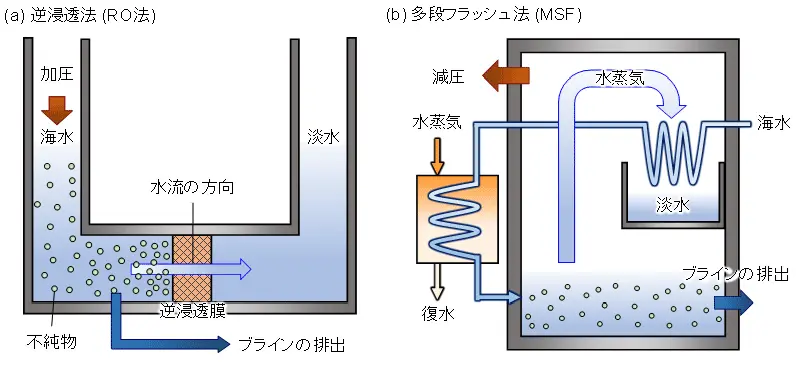 - 海水淡水化プラント:海水から淡水を生産するためのプラント。海水を淡水化する原理として、図4に示すように半透膜を利用して水だけを透過させて得る逆浸透膜(Reverse osmosis)法や海水を蒸発させて水を得る多段フラッシュ法がある。