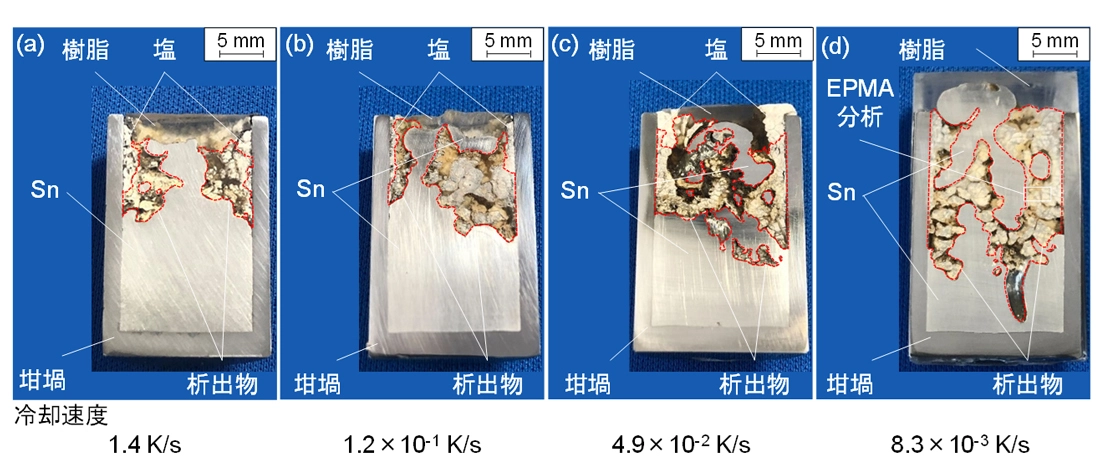 図1(a)に示す実験体系で、300℃に加熱した液体金属錫の液面に対して、ブラインを約8時間連続して噴霧しました。ブラインを液体金属錫に直接接触させることで、液体金属錫の表面では淡水の蒸気を蒸留の原理で生産し、一方でブライン中に含まれるNaやMg、Ca、Kなどの金属元素を液体金属錫中に溶解させて濃縮できることが分かりました。次に、図1(b)に示す実験体系で、ブラインに接触させた錫をゆっくりと冷やすことにより、錫の中に溶解した金属元素を析出物として回収できることも分かりました。図2はブラインと接触させた後に冷やした錫の断面を示します。海水に含まれる金属などの析出物が錫の中に存在していますが、冷やす速度を遅くした方が、析出物の成長が促されることが分かりました。
