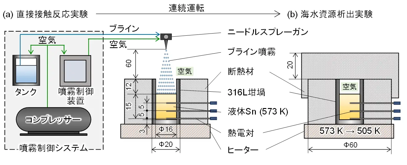 液体金属錫は核融合炉[用語3]などの冷媒として期待されているものですが、金属との強い反応性により構造材料を腐食してしまう課題がありました。本研究では、液体金属錫の欠点とされてきた金属との反応性を活かすことにより、淡水化ブラインに含まれる海水資源を効率良く回収できることが分かりました。この技術では、300℃に加熱した液体金属錫の表面にブラインを噴霧することにより、ブラインを蒸留して淡水を生産しながら、ブライン中に含まれるNaやMg、Ca、Kなどの海水資源を回収することができます。海水資源を液体金属錫中へと溶解させた後は、ゆっくりと冷やすことで、各金属元素を析出させて回収します。