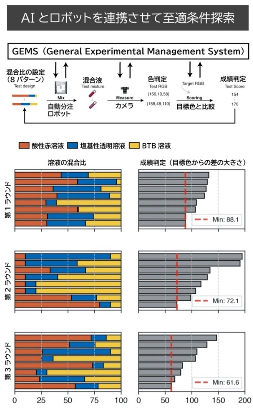 上)自律運用の模式図。1回の実験で8パターンの混合液の色を解析し、目標とした色との差を解析した。GEMSは、「サンプルの状態(液色)」「行う実験操作(混合)」「観測(撮影)」「実行規則(目標色との差に基づき次の状態とその状態での実験操作を決める)」を分けて扱うことで、混合比の至適条件を自律的に探索する。
