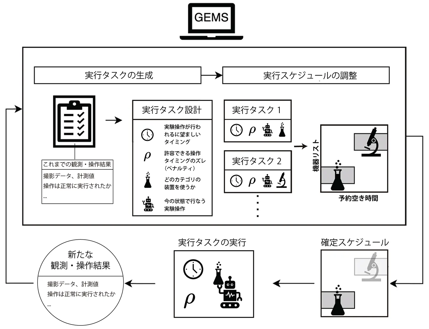 東京科学大学 総合研究院 難治疾患研究所 ロボット科学分野の神田元紀教授、理化学研究所(理研) 生命機能科学研究センター AI生物学研究チームの尾崎遼チームディレクター、筑波大学 ヒューマニクス学位プログラムの田原(新井)悠也大学院生(理研 生命機能科学研究センター AI生物学研究チーム研修生)らの共同研究グループは、実験科学において従来は自然言語で記述されてきた実験手順[用語1]を、「実験が進むとサンプルの状態[用語2]がどのように変化するか」という観点で整理し、実験中の観測・操作結果に応じて「今の状態で行う実験操作」と「次に遷移するサンプル状態」を自動的に選択しながら実験を自律運用するソフトウエア基盤「GEMS(General Experimental Management System)」を開発しました。