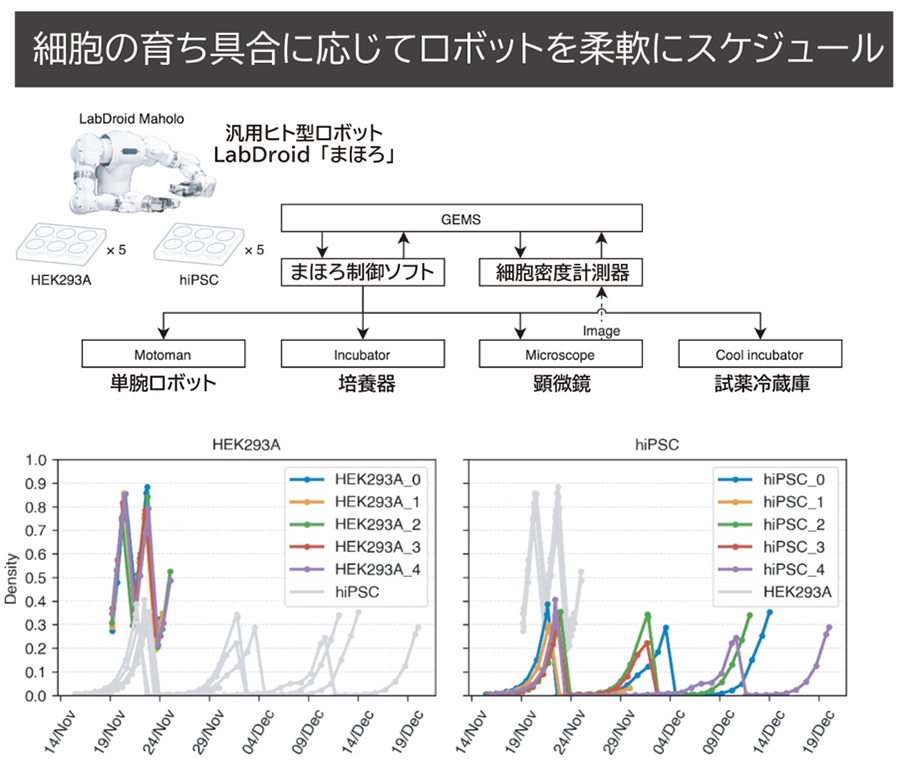 上)自律運用の模式図。ピペット操作や細胞培養器の扉の開け閉めなど人間と同じ動作が可能なロボット「まほろ」が主な実験操作を担い、まほろと周辺機器をGEMSが管理する。培養する細胞株はヒト胎児腎細胞(HEK293A)およびヒトiPS細胞(hiPSC)とし、6穴の細胞培養プレート各5枚を用いて培養した(1枚のプレートが一つの培養系列に相当)。