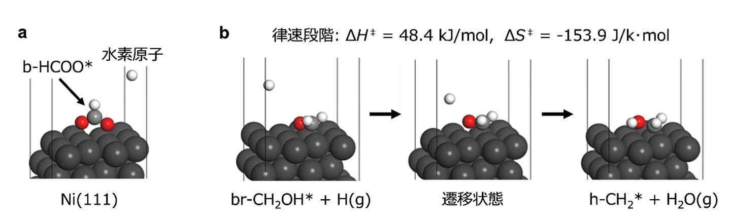さらに、研究グループが独自に開発したin situ赤外吸収分光を用いて反応中間体の反応性を厳密に調査し、その結果b-HCOO*(*は表面吸着を、bはbidentate(二座)を意味します)がメタネーションの主要中間生成物であり、プラズマ照射によってb-HCOO*がCH4へ転換される反応が促進されることを明らかにしました。このような実験的観察に基づき、Niに吸着したb-HCOO*と水素原子に対して量子化学計算を行いました(図3a)。b-HCOO*からCH4にいたるまで8つの反応過程があり、そのうち2つの反応が大きなΔH‡(例えば48.4 kJ/mol)を示しました。これらの反応はC=O結合を解離する反応で、これが水素原子との直接反応で促進されます。また、ΔS‡は大きな負の値(-153.9 J/K・mol)を示しましたが、これは反応初期状態で気体として存在する水素原子のエントロピー損失に起因します。この段階で計算されたΔH‡およびΔS‡値がアイリングプロットで推定した実験値(図1c、54.7 kJ/mol、-164.4 J/K・mol)とよく一致していることがポイントであり、水素原子がEley-Rideal反応により律速反応のエネルギー障壁を下げていることを明らかにしました。水素原子が関与する表面反応はこれまで熱フィラメント法によって研究されてきましたが、プラズマを用いると振動励起分子と水素原子を同時に供給できるのが特徴です。さらに、固定床や流動層反応器の中でプラズマ反応を利用できるため、本研究成果は工業的方法で実用プロセスに応用できるという点で意義があると言えます。
