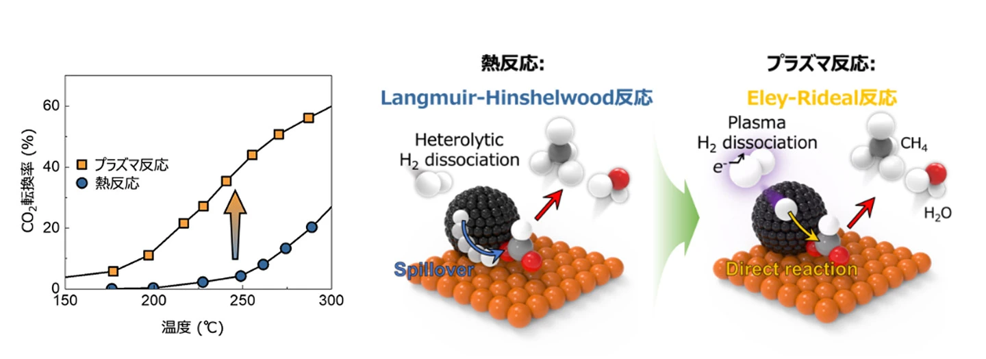- 非平衡プラズマによって水素原子を生成し、触媒反応に作用させることで、二酸化炭素(CO2)をメタン(CH4)に転換するメタネーション反応の低温化を実現