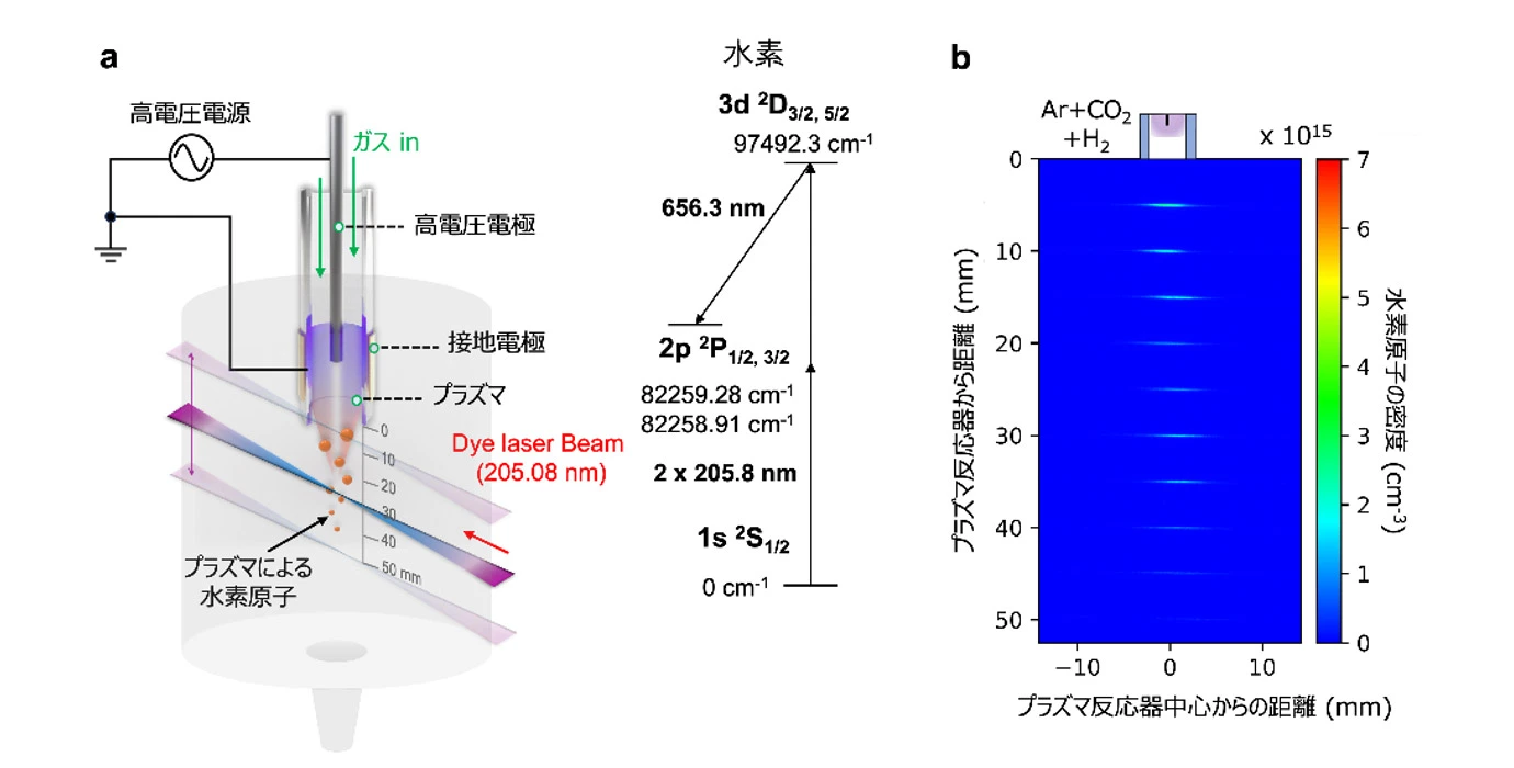 本研究では、二光子吸収レーザー誘起蛍光法[用語5]により水素原子の絶対密度と経時変化を測定しました(図2a)。プラズマ反応器から噴き出した水素原子の密度はそれほど減衰せず、数10 mm離れた空間まで輸送されていることを観察しました(図2b)。このことは、プラズマによって生成された水素原子は比較的長寿命であり、触媒表面まで失活せずに到達していることを示しています。