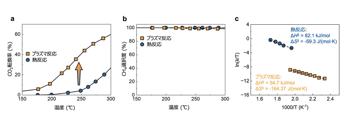 低温下にも関わらず振動励起しているCO2(高温下であるかのように活性化され振動している)とともに、水素原子を同時に生成できる非平衡プラズマを触媒反応と組み合わせた低温化学反応システム(以下、プラズマ反応)を構築し、熱依存型の従来システム(以下、熱反応)と比較して低温でメタネーションを実現しました。さらに、本研究では触媒としてNi/Al2O3(非貴金属触媒)を使用しており、98 %以上の高いCH4選択率(図1b)とともに230 ℃の低温でCO2の転換率が熱反応と比較して11倍以上向上することに成功しました(図1a)。