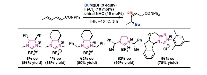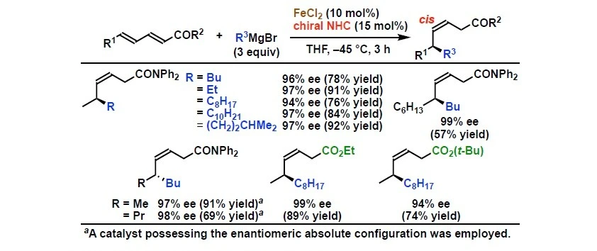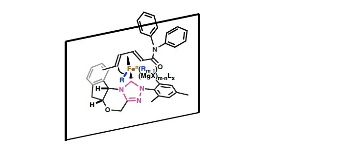 図. 鉄/キラルNHC触媒による脂肪族グリニャール反応剤の α,β,γ,δ-不飽和カルボニル化合物への不斉1,6-付加反応