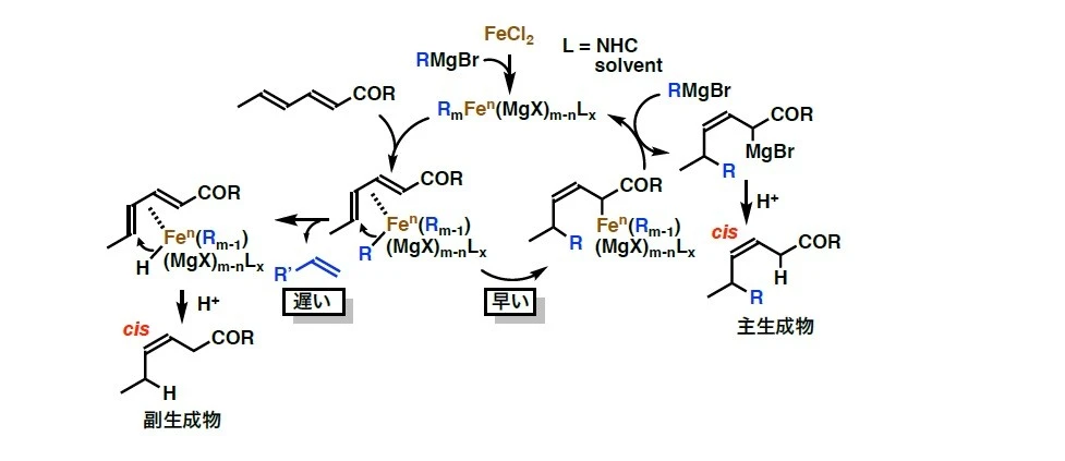 • 豊富で安価な鉄を用い、これまで制御が極めて困難だった脂肪族グリニャール反応剤による不斉1,6-付加を世界で初めて実現。