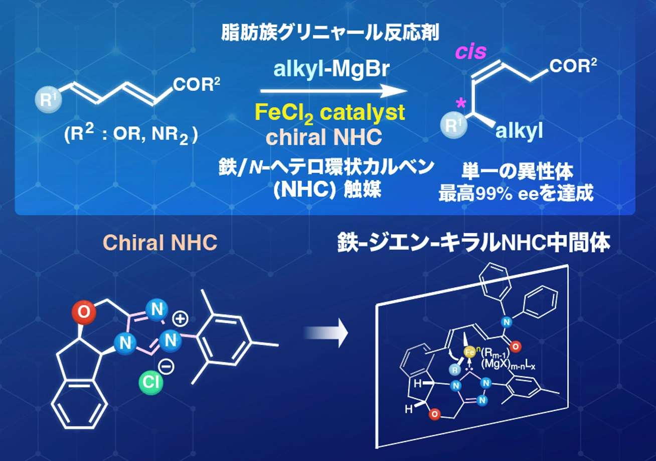 東京科学大学(ScienceTokyo) 生命理工学院 生命理工学系の秦猛志 准教授らの研究グループは、鉄とキラルNHC[用語1]配位子を組み合わせることで、α,β,γ,δ-不飽和カルボニル化合物に対する脂肪族グリニャール反応剤[用語2]の高選択性での不斉1,6-付加反応を世界で初めて実現しました。