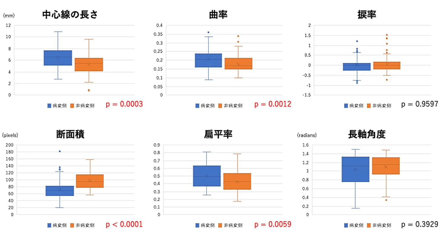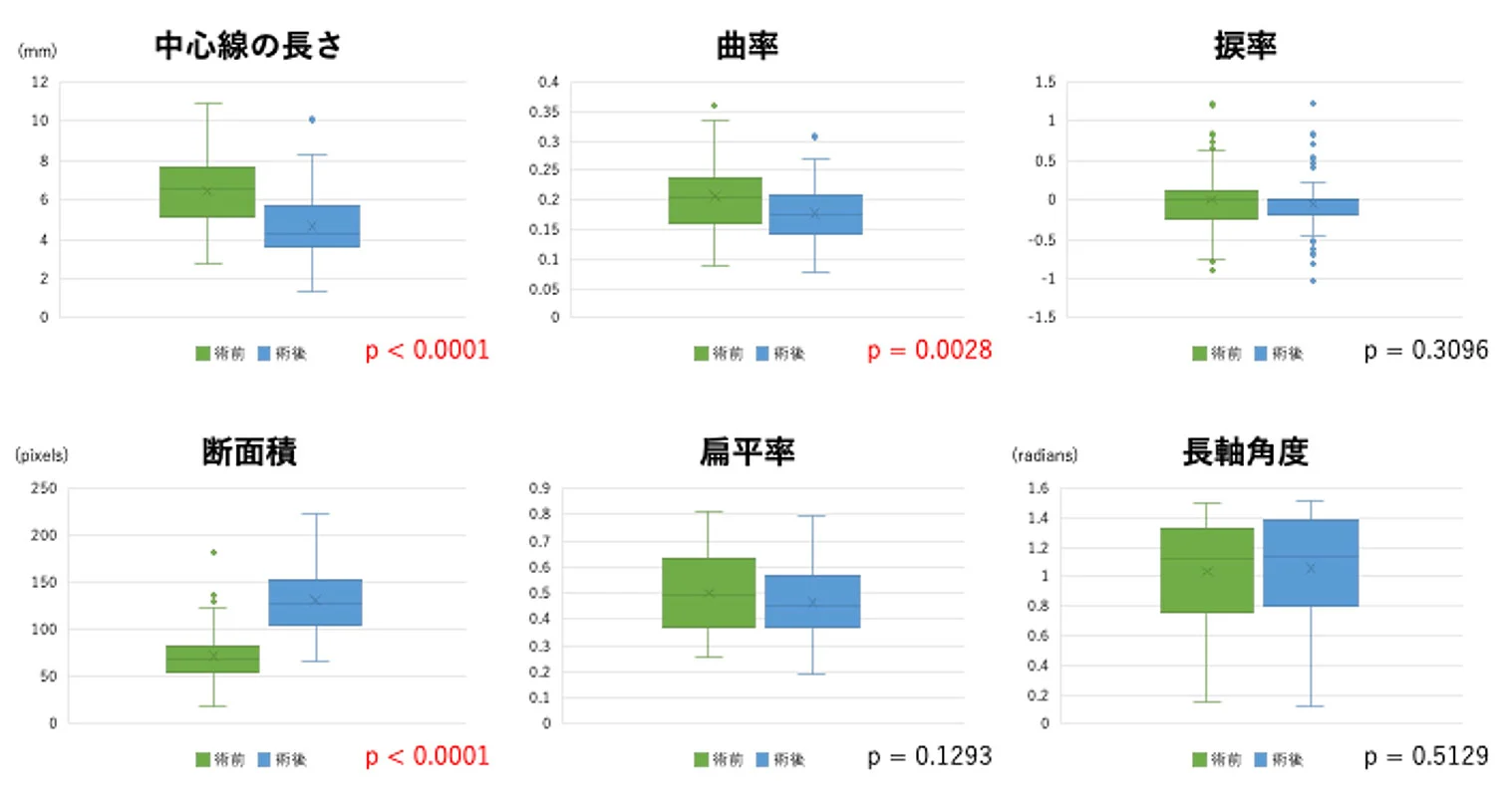 病変側の三叉神経は非病変側と比較して、有意に中心線が長く、曲率が大きく、断面積が小さく、扁平率が大きいという結果でした(図4)。また、術前の三叉神経は術後と比較して、有意に中心線が長く、曲率が大きく、断面積が小さいという結果でした(図5)。以上から病変側の術前の三叉神経では、中心線が長く湾曲し、断面積が小さく扁平であることが分かりました。また、治療成績の良かった群では、術後に断面積がより大きく変化していることが分かり、術後の神経膨張が良い手術成績と相関している可能性が示唆されました。