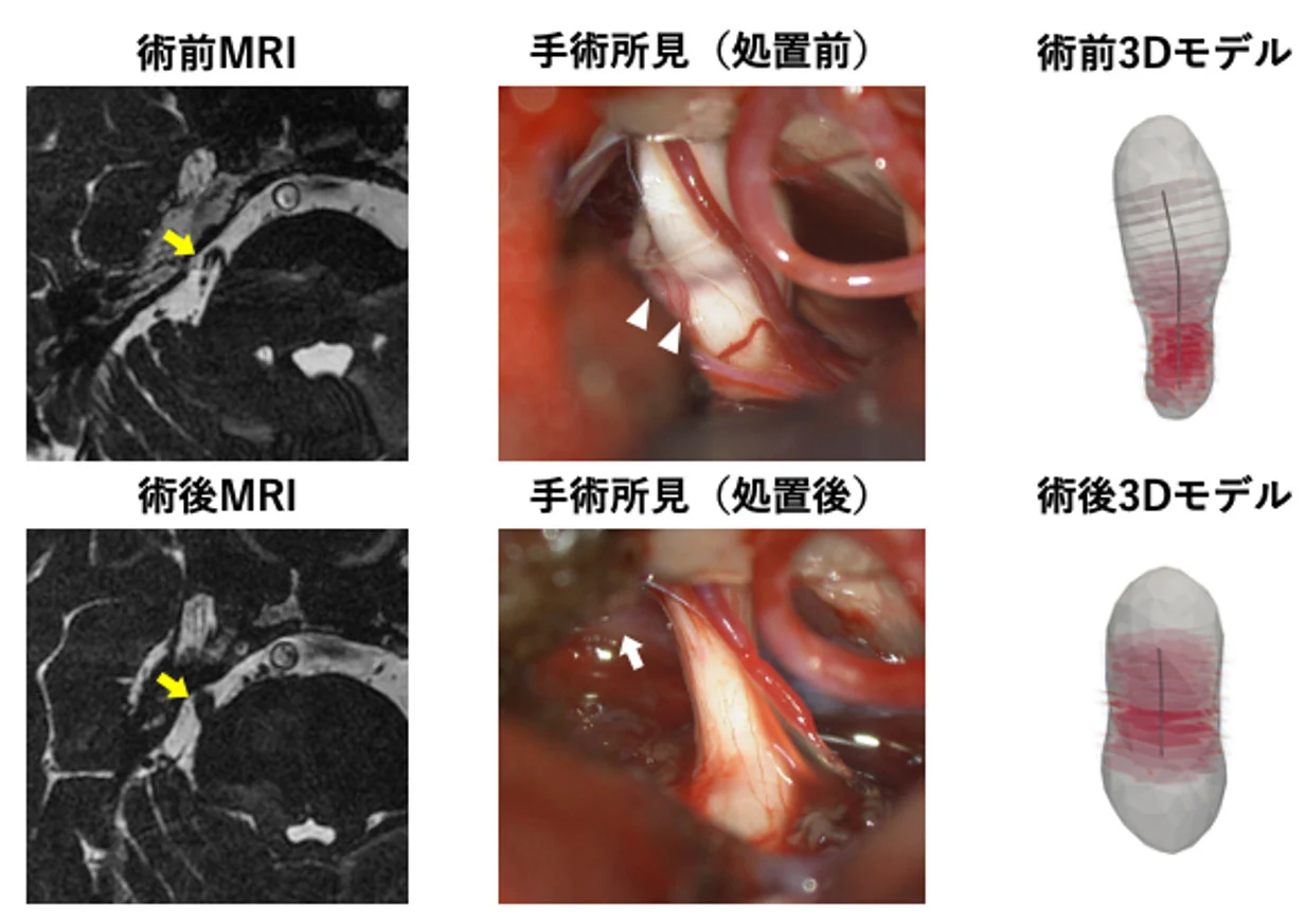 三叉神経痛の主な原因は血管による神経の圧迫であると考えられており、神経減圧術[用語2]によってこの圧迫を解除することにより症状を改善することが示されています(図1)。しかし、三叉神経痛の中には血管による圧迫を認めない症例があり、このような場合には三叉神経にゆがみやねじれなどの形態変化が起こっていることが報告されています。したがって、血管による圧迫だけでなく、三叉神経の形態変化自体も三叉神経痛の原因となっている可能性があります。三叉神経の異常な形態変化を定量化し、客観的に評価することで、三叉神経痛の原因解明、診断、手術の意思決定に役立てるために本研究を実施しました。