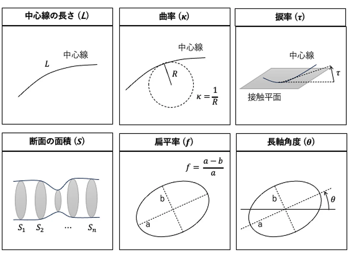 2016年1月から2022年12月に神経減圧術を行った70症例(平均年齢69歳)を対象に解析を行いました。術前と術後のMRI画像から三叉神経のセグメンテーション[用語3]を手動で行い、3Dモデルを作成しました。3Dモデルに対して細線化処理[用語4]を行い、神経の中心線を抽出し、さらに中心線に垂直な方向に3Dモデルの再スライスを行って複数の断面画像を作成しました(図2)。中心線の長さ、曲率、捻率[用語5]、断面の面積、扁平率、長軸角度と6項目(図3)について、病変側と非病変側、術前と術後の比較をそれぞれ行いました。