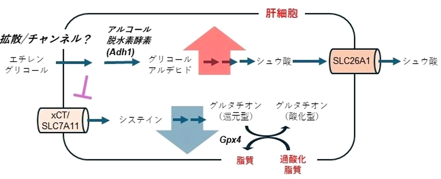 SLC7A11-Gpx4経路の低下が関与していることから、フェロトーシス、もしくはそれに類似した細胞障害機構が想定されます。本研究成果は、エチレングリコール中毒を早期段階から検出し、適切に対処する方法の開発につながる可能性を示すものです。
