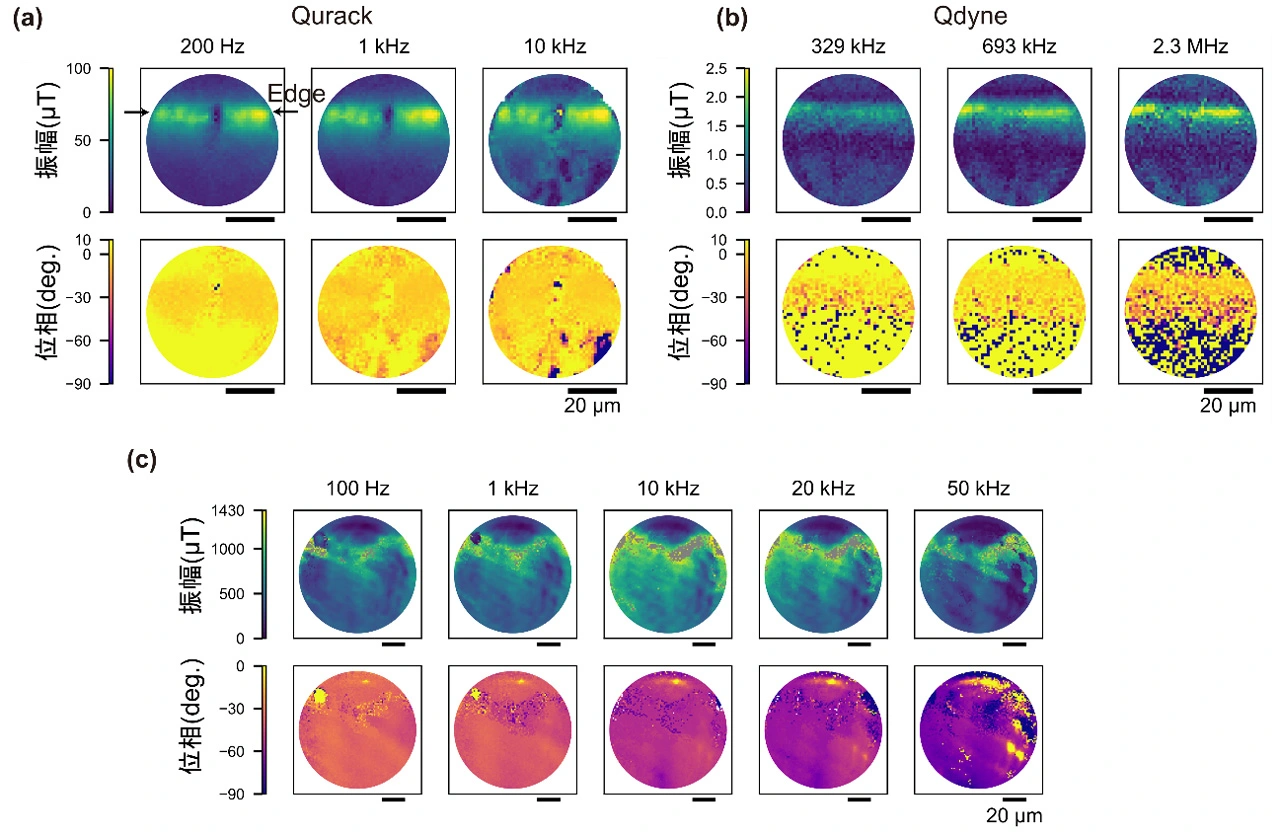 図2はセンサの動作実証のために行った実験の結果です。コイルから発生する交流磁界をイメージングしたもので、100 Hzから2.34 MHzまでの広い周波数帯域に渡って、狙った通り、一定の結果が出力されています。図3は磁性体の交流磁気特性をイメージングしたものです。図1に示すセットアップで測定を行いました。本学電気電子系の中川研究室が開発した高周波インダクタ用CoFeB-SiO2薄膜を測定対象としました。本試料は高周波動作におけるエネルギー損失を抑えるために、面内の磁気特性の非対称性(一軸磁気異方性、用語7)が付与されています。そのため、面内のある方向と90°回転させた方向に磁界を印加した場合で、全く異なる特性を示すことが期待されます。実際の結果として、ある方向(困難軸方向)に磁界を印加した場合は、100 Hzから2.3 MHzまでほぼ類似する傾向を示しました(図3 a,b)。しかしながら、90°回転させた方向(容易軸方向)の場合は、周波数の増加に伴い、位相が遅れる様子が示されました (図3c)。前者は周波数に対して軟磁性材料中のエネルギー損失が一定であること、後者はエネルギー損失が増加することを示唆します。