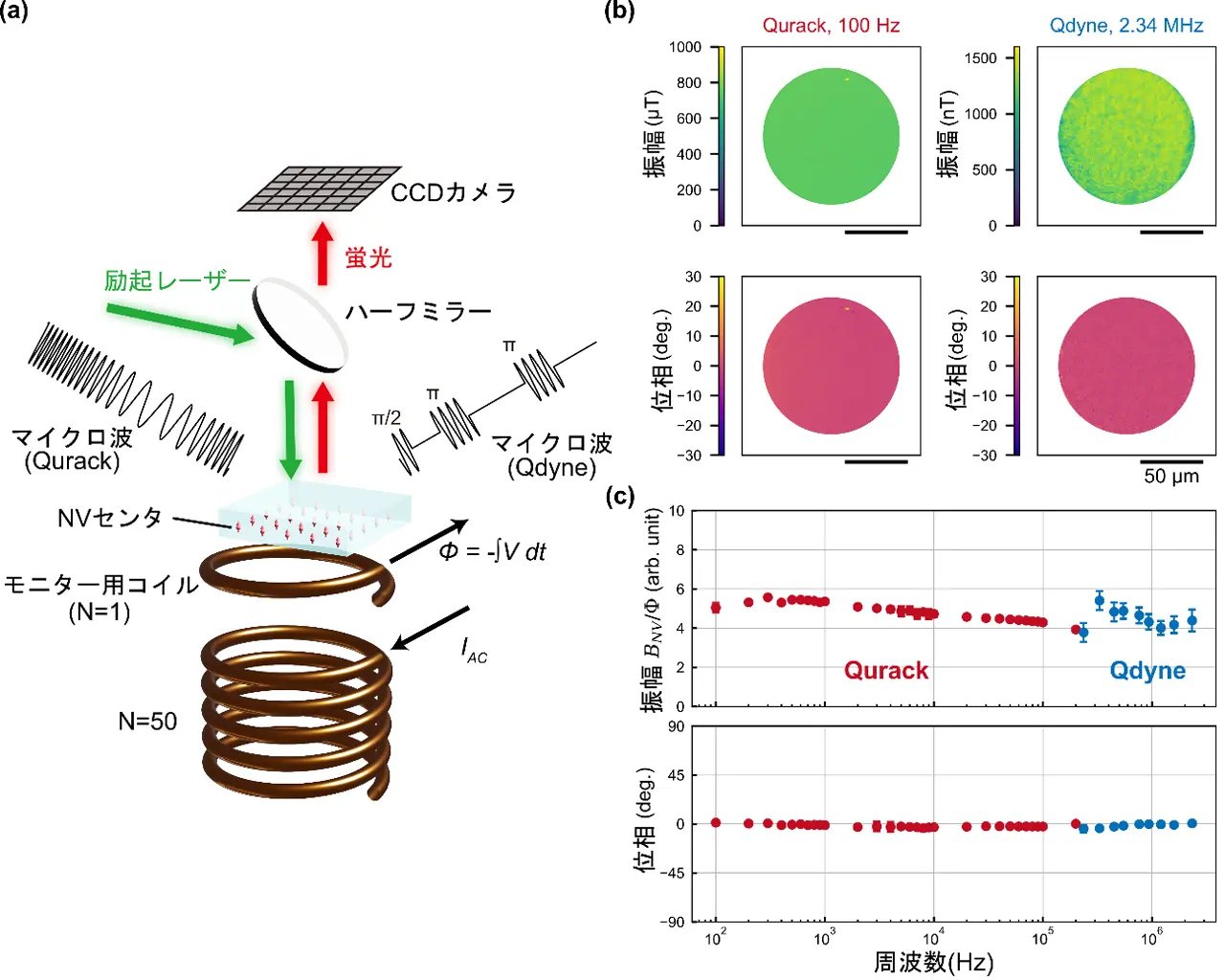 本研究では、kHz帯とMHz帯で異なる量子計測シーケンスを組み合わせることで、これまでは困難だった数MHzまでの広い周波数範囲で磁場をイメージングする方法を確立しました。具体的には、ダイヤモンド中に形成した膜厚数µmのNVセンタ層が局所的な磁気センサとして動作する装置構成を検討しました(図1)。NVセンタから発せられる赤色蛍光をカメラで撮影することで、磁場がイメージングされます。本研究では量子力学を活用し、量子操作に用いるマイクロ波の照射の方法を工夫することで、高周波帯域でのイメージングを試みました。kHz帯域を得意とするQurack法(用語5)およびMHz帯域を得意とするQdyne法(用語6)を用いることで、kHz帯-MHz帯の交流磁場の周波数をカメラが追従可能な帯域までダウンコンバートする技術を開発しました。