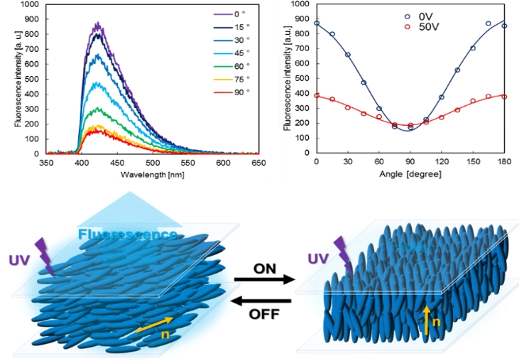 有機π電子系分子の液晶の低温化・低粘度化の実現は、液晶レーザーや円発光素子などのフォトニックデバイスデバイスを革新します。従来、液晶相は「場」であり、そこにごく微量の色素をドープしてデバイスを製作していましたが、本研究で得られた分子を使うと、光を操る場そのものを全て蛍光性分子で作製することができます。複屈折性、発光性、電場応答性の効果は数桁上がると予想され、材料科学的に興味深いものと言えます。そこで、実際に剛直なπ共役系分子を動的なデバイスに応用できるのかを検証しました。具体的には、橋かけスチルベン液晶の電場応答性を確認するとともに、液晶ディスプレイの原理を発展させた新しい概念の発光スイッチングデバイスを試作しました。現在使われている電場応型のTN型(ねじれたN相)ディスプレイは、電場により液晶に対して「ねじる⇔元に戻す(立たせる)」操作を行い、光の透過を制御し、偏光板と組み合わせて光シャッターを作っている。本研究グループでは、この原理を転用して、光が透過しない=光を吸収する「液晶がねじれた配向」で強発光し、光が透過する「液晶が垂直に立った配向」では発光しないデバイスを、数種類の橋かけスチルベン液晶をブレンドした室温ネマチック液晶を用いて製作しました。その結果、強度比で約5倍の差が観察され、応答速度は電源オンで0.14 s、電源オフで0.35 sと極めて高速であることが明らかになりました(図2)。単一成分の液晶でありながら、極めて良好な電場応答性を有しており、動的な用途にも活路を拓くものです。