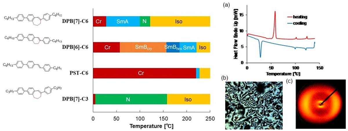 岩井、小西は、長年の課題に対するブレークスルーとなる液晶分子を、凝集誘起発光のメカニズム解明で考案した橋かけスチルベン(Angew. Chem. Int. Ed. 2020, 59, 10573)の研究を発展させる中で偶然発見しました。この分子系は、長い棒状分子をやわらかな環状構造に含有することにより、ネマチック相を誘起し、さらに液晶転移点の大幅な低下を実現することができます。研究チームは今回、環状構造を持つ分子の相転移挙動の特異性を明らかにするためにアルキルテイルを-C6H13に固定して、環状構造の違いによる液晶挙動を比較しました。環状構造のないPST-C6では、230℃以上で数℃の範囲でスメクチックA相(SmA)[用語6]、6員環構造のDPB[6]-C6では、降温過程で3つのSm相が観察されました。一方、7員環構造のDPB[7]-C6では、室温付近でSmA相が、100℃付近でネマチック相(N相)が観察されました(図1(b))。一般にアルキルテイルを短くするとN相が発現しやすいため-C3H7にしたところ、N相のみが観察され、DSC測定(図1(a))によるネマチック相の発現温度は、昇温過程でTCry-N: 52.6-160.4 [°C]、降温過程で4.8-158.3 [°C]と、室温付近でN相を利用することができることが分かりました。広角X線構造解析を行ったところ、N相の粘度は低く、鮮明な画像が得られ、分子の面間隔も汎用のシアノビフェニル系の液晶と同程度で、配向度も高いものとなりました。そして、このような液晶挙動を示す理由が、環状構造を持つ分子がとりうるコンフォメーション[用語7]の多様性と運動性によるエントロピーの効果であることを明らかにしました。