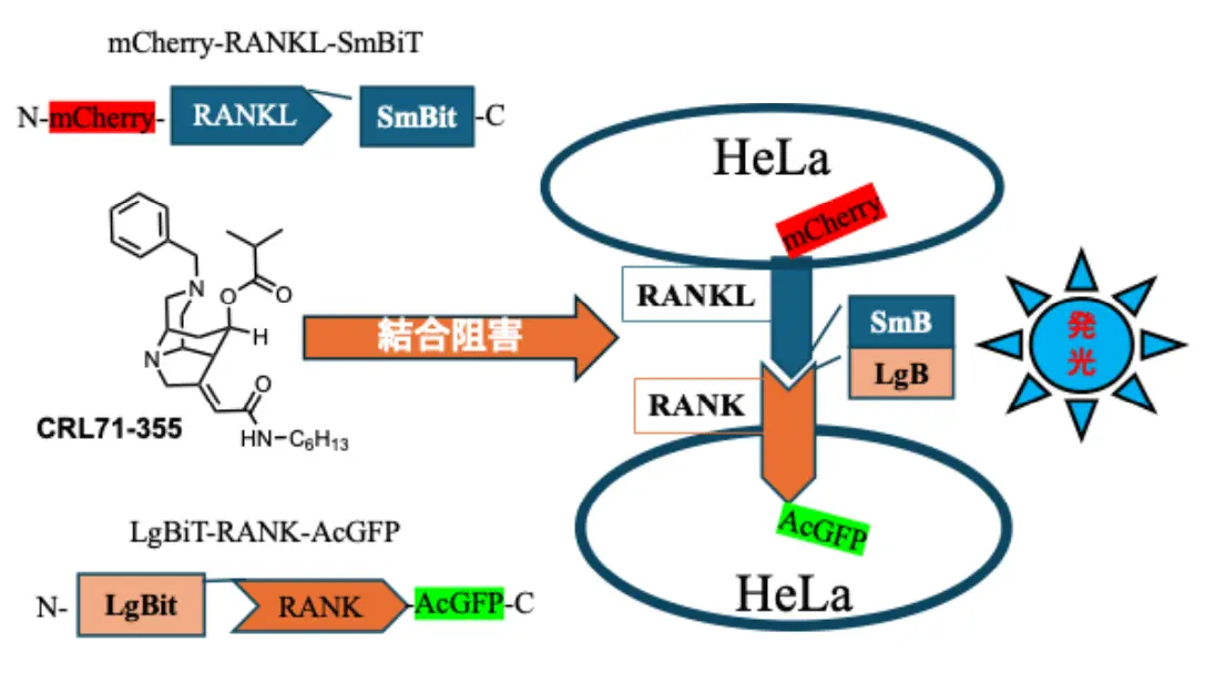 そこで本研究チームは、RANK(RANKL受容体)-RANKLの結合を、生きた細胞で可視化・定量化できる実験系の構築を試みました。