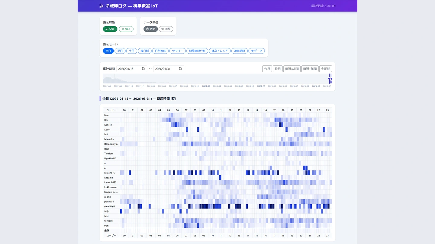 ワークショップ終了後、参加者は自宅の冷蔵庫にデバイスを取り付け、実際のデータ計測をスタートさせました。蓄積されたデータは専用の可視化ページで確認することができ、すでに多くの「生活の記録」が集まっています。