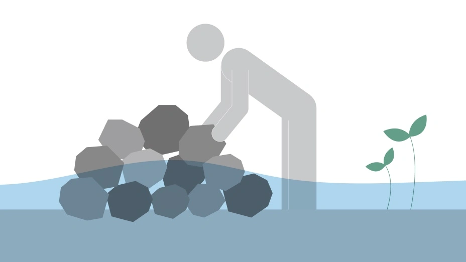 これからの防災工学が目指すべき理想は、従来の工学的手法を超越した「ハイブリッド防災」の実現である。それは自然の力を最大限に活用するグリーンインフラ[用語1]、すなわちマングローブ林のような沿岸植生が持つ減災機能と、必要最小限の工学技術を融合させることで達成される。この融合アプローチの最終的な目標は、人の手を最小限に抑え、自然の回復力(レジリエンス)を内包した持続可能な防災システムを構築することだ。具体的には植生が持つ津波や高潮エネルギーを減衰させる効果を定量化し、その生態学的機能を最大限に引き出すための、低コストで簡易な工学技術を組み合わせる。例えば植林初期に波浪から苗を守るポータブル消波工(図1)(人力で移動可能な防波堤)のような中間技術を導入。植林が減災効果を発揮できるように成長した段階で、ポータブル消波工はその役目を終え撤去。最終的には自然が自然を守る自律的システムへと移行する。