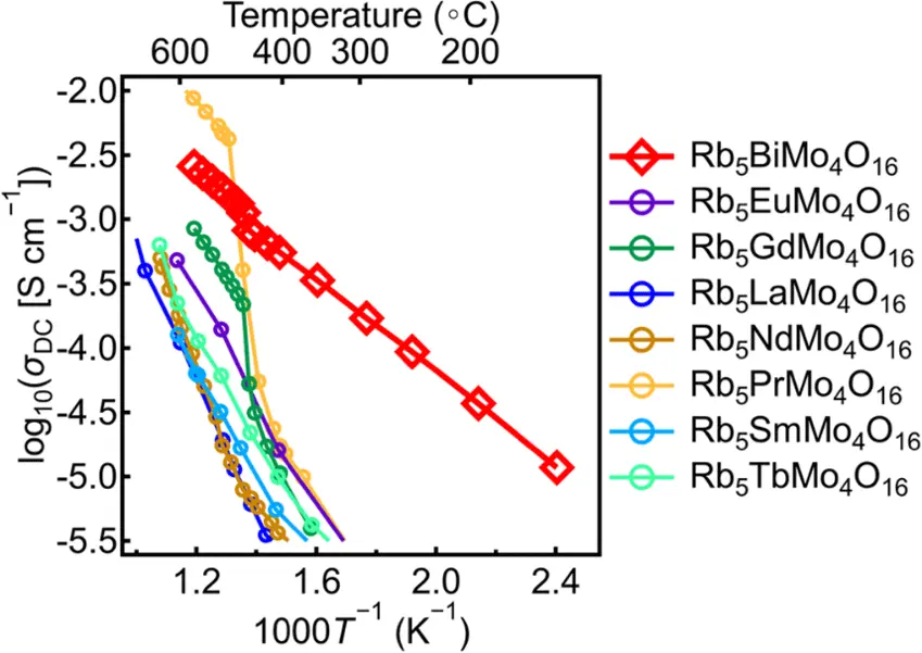 Rb5RMo4O16材料(R:ランタン(La)、プラセオジム(Pr)、ネオジム(Nd)、サマリウム(Sm)、ガドリニウム(Gd)、テルビウム(Tb)、ユーロピウム(Eu))を固相反応法により合成して、予備的な直流電気伝導度測定を行いました(図6)。その結果、顕著に高い電気伝導度を示すことが分かり、さまざまな化学組成を持つRb含有酸化物イオン伝導体が示唆されました。
