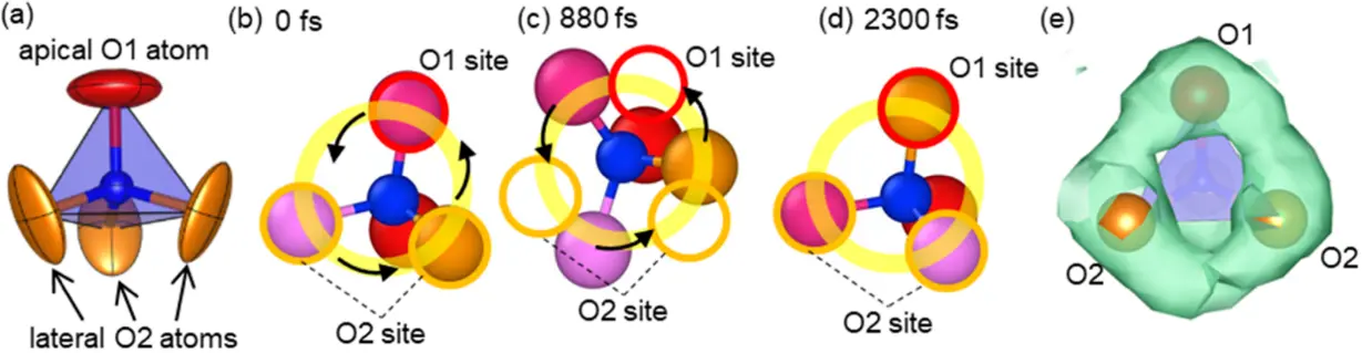 Rb5BiMo4O16が高い酸化物イオン伝導度を示す原因を解明するため、19℃から540℃の温度範囲で中性子回折実験[用語7]を行い、リートベルト法[用語8]により結晶構造を解析しました。その結果、Rb5BiMo4O16はMoを含み、酸素が欠損した立方最密充填c'層と2つの六方最密充填h層が 交互に積み重なった構造を持つことが明らかとなりました(図4a)。この構造は、MoO4四面体とRbとRb/Bi原子から成ると見なすこともできます。MoO4四面体は1つのMo原子を中心に置いた1つの頂点酸素と3つの側面酸素から構成されます(図5a)。解析した構造において、酸素原子が極端に大きな異方性熱振動を示すことが分かりました(図4a、5a)。この酸素原子の大きな変位は大きな熱振動を示しており、これが高い酸化物イオン伝導度の原因の一つであると考えられます。また、この酸素原子の変位の方向、第一原理分子動力学(AIMD)シミュレーション[用語9](図5)、結合原子価法により求めた酸化物イオンのエネルギー図(図4)などから、MoO4四面体の回転が生じていることが分かりました。この回転により、四面体内の酸化物イオンが四面体内を移動します。また、四面体間を酸化物イオンが移動することも、大きな酸素原子の変位の方向および結合原子価に基づいた酸化物イオンのエネルギー図(図4のオレンジの点線と赤の点線)から示唆されました。パルミエライト型構造ではMoO4四面体のユニークな配置により、MoO4四面体間の酸化物イオン移動が起こり、高酸化物イオン伝導性を発現すると考えられます。また、RbのサイズはSrより大きく、MoのサイズがVより大きいので、同じパルミエライト型構造を持つSr3V2O8(図3bのピンク色の線)に比べてRb5BiMo4O16(図3bの赤色の線とダイヤの記号)では酸化物イオンが移動するエネルギー障壁と酸化物イオン伝導度の活性化エネルギーが低く、そのため480℃以下の中低温で高い酸化物イオン伝導が生じると考察されました。