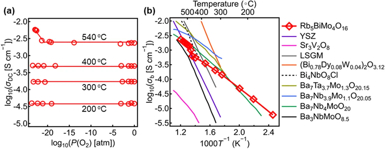 (1) 酸化物イオン伝導体Rb5BiMo4O16の高い電気伝導度と安定性