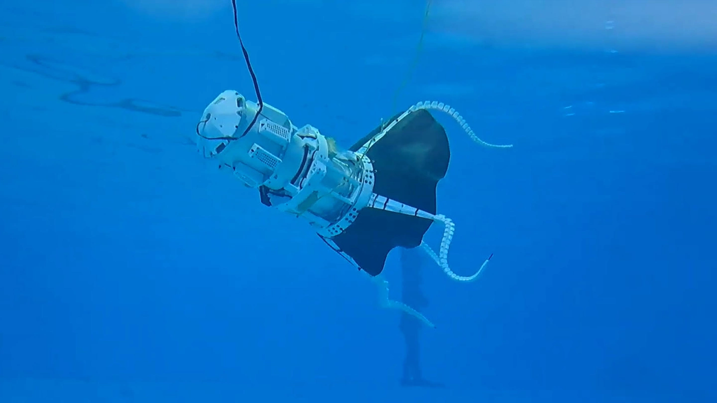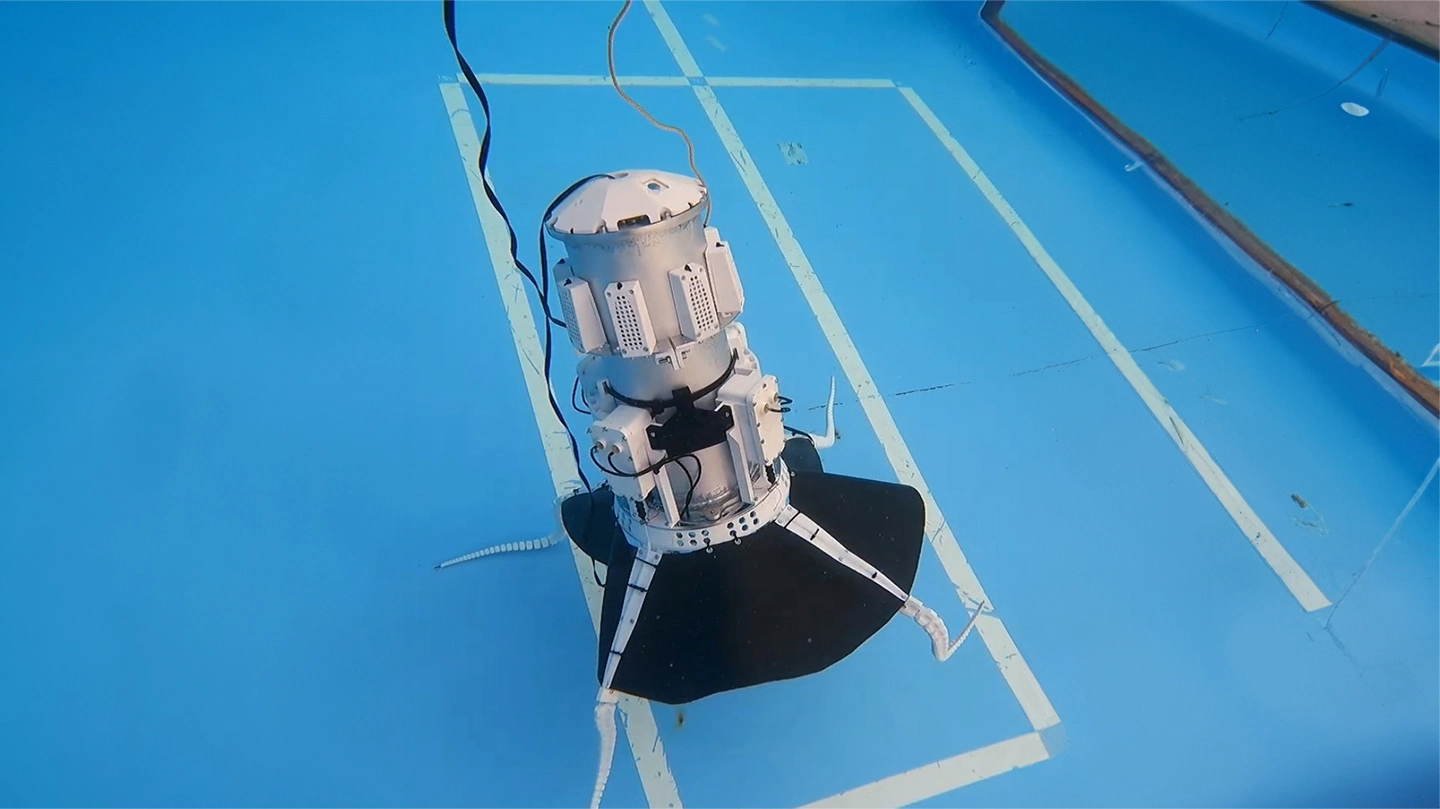 本機体の主な動きは膜による操舵とスラスタによる推進を組み合わせたもので、脚を動かして膜の形状を変化させ、水から受ける抵抗の向きを変えて方向転換を行います。スラスタによる推力補助と合わせて素早くダイナミックな動きが実現できます。