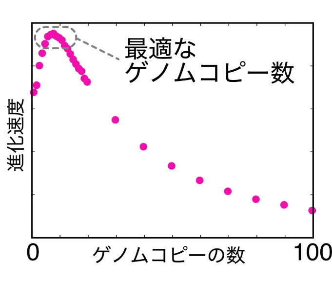 - ゲノムコピー数が少ない方が漸進的な進化の速度は速く、ゲノムコピー数が多い方が新規形質の進化の速度が速いことを理論的に解明