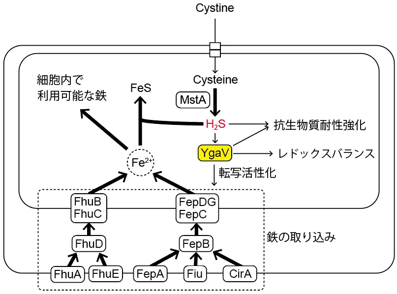 大腸菌は、MstAによる硫化水素合成を介してYgaVの転写制御能を調節することで、鉄の取り込み活性を適切に保ち、その結果、活性酸素種の生成をできる限り抑制していると考えられる。また、この切り替えは、薬剤耐性を示す上で重要な役割を果たすことも分かった。