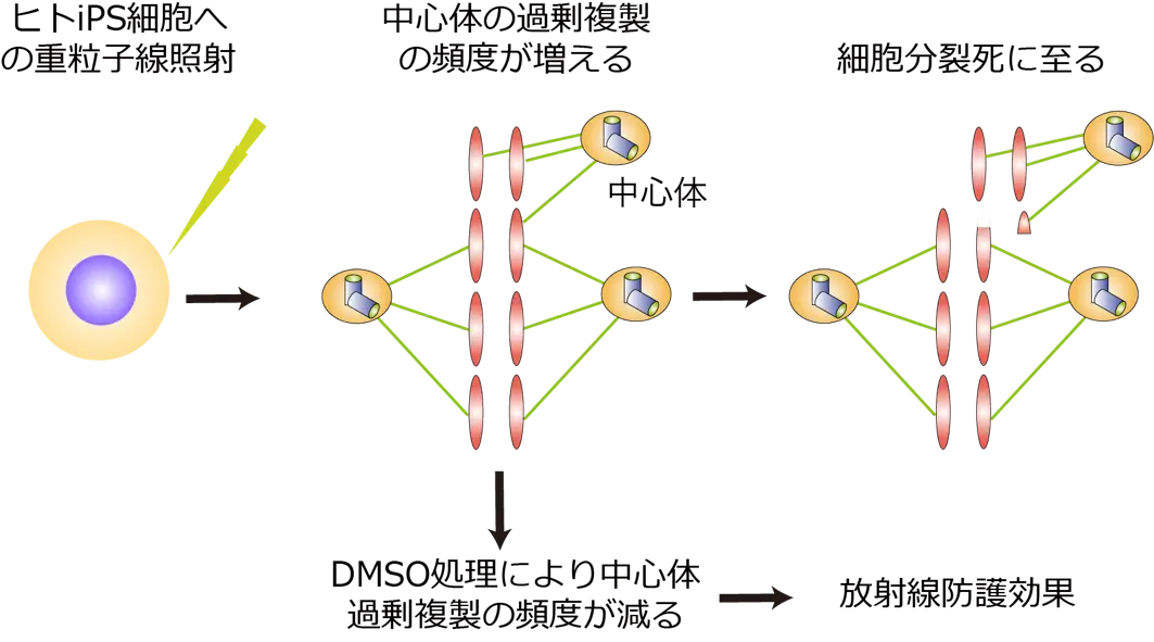 これらの背景を受けて、研究チームはヒトiPS細胞に対する重粒子線とガンマ線の影響を評価した結果、細胞内小器官である中心体の過剰複製と細胞分裂死を高い頻度で誘導し、特に重粒子線でその頻度が高いことを発見しました。また有機溶媒であるDMSOはその影響を低減することから、中心体異常を指標とした放射線防護効果を持つことを明らかにしました。
