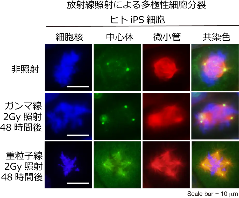 - 重粒子線がヒトiPS細胞で中心体過剰複製を増加させることを確認。