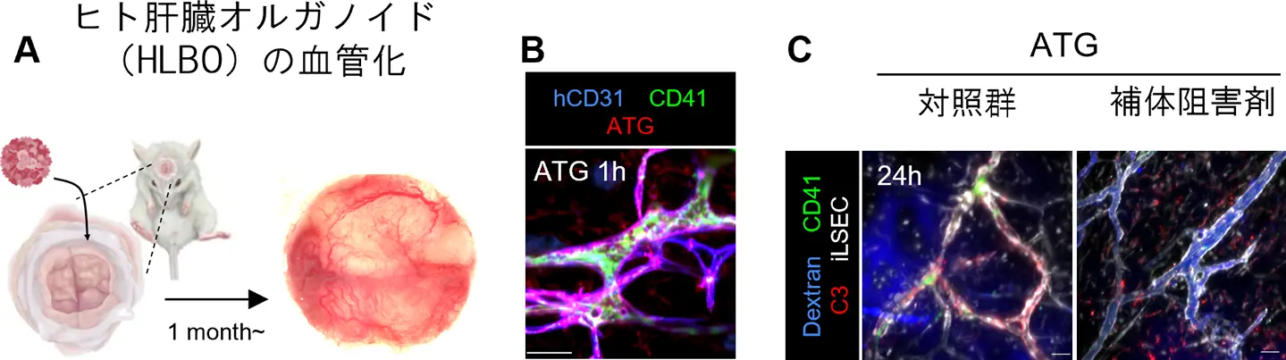 ヒト類洞構造を有する肝臓オルガノイドに、臓器移植後の免疫抑制剤であるATGを投与し、段階的に血栓形成が進行するメカニズムを解明した。