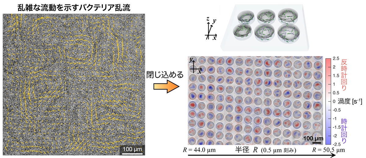 - 異なる半径の円形領域内のバクテリア集団を同時観察し、渦が不安定化する転移点近傍でのダイナミクスを詳細に解明。
