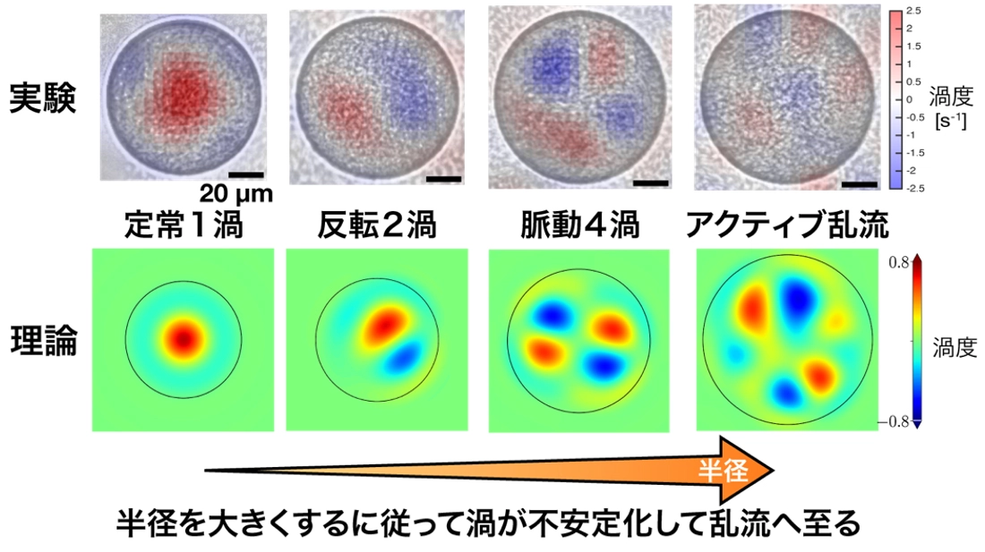 次に、これらの実験での観測結果を、バクテリア集団運動の速度場を記述する連続体方程式を用いた数値計算により再現することにも成功しました。さらに解析的な計算により、この遷移過程の数学的な性質と不安定化のメカニズムを力学系理論[用語6]の観点から明らかにしました。これにより、実験・数値計算・解析的理論のいずれにおいても、渦の反転周期の半径依存性などにおいて整合する結果が得られたことになり、渦の安定化および不安定化の条件を理論的に予言できるようになりました。