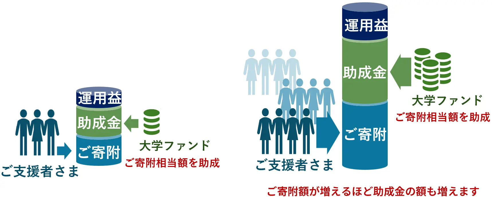 例:任意のサークルへご寄附を賜る場合、ご寄附額は全額、任意のサークル活動に充てられます。ご寄附相当額の助成金と、運用による運用益については、国際卓越研究大学の計画を実行するための資金に充てられます。