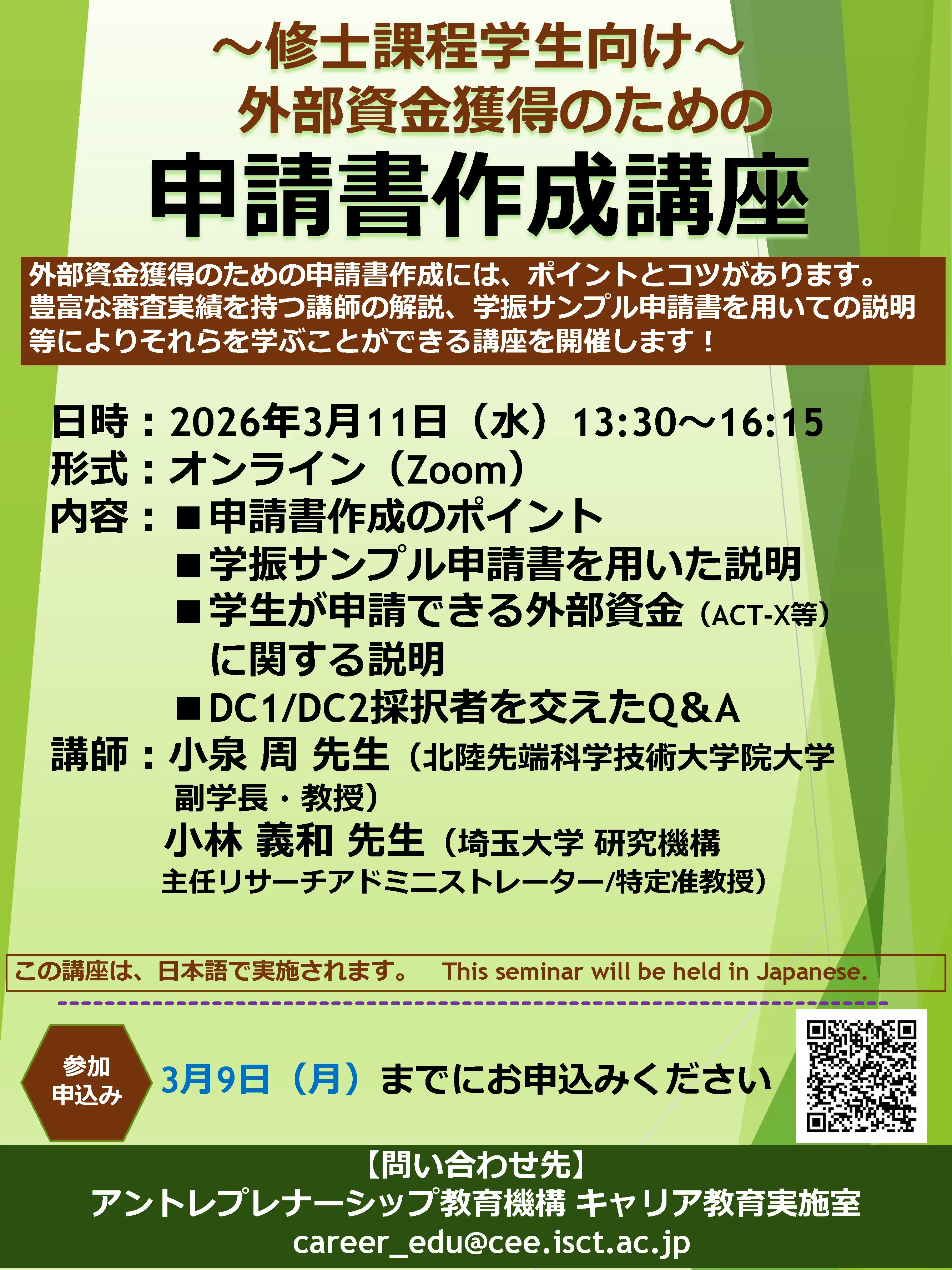 豊富な審査実績を持つ講師の解説、学振サンプル申請書を用いての説明等によりそれらを学ぶことができる講座を開催します!