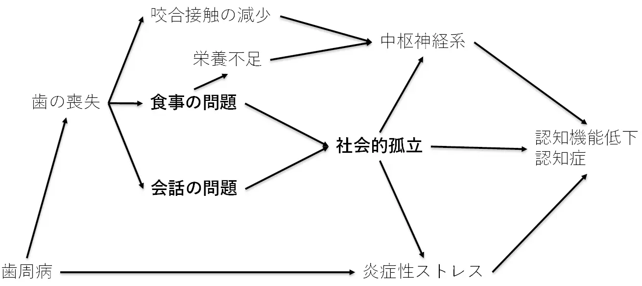メカニズムの面では、食事や会話といった基本的な口腔機能が社会的孤立を防ぐ役割を果たすにもかかわらず、これまでほとんど議論されてきませんでした。社会的孤立は、認知症の修正可能なリスク因子の一つとされており、口腔機能の低下が社会的孤立を介して認知症リスクを高める可能性があります。この仮説は、媒介分析を用いた研究によって支持されています。