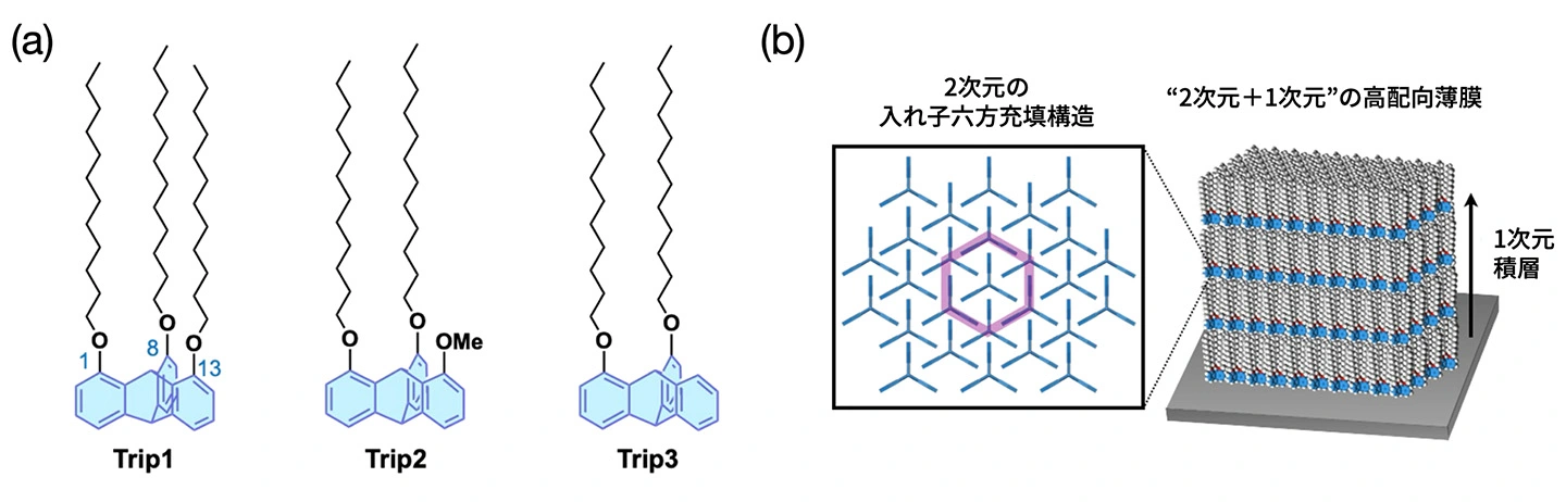この課題に対し、福島孝典教授らは、3枚の羽根を持つプロペラのような形状をしたトリプチセン[用語3]という分子に、長いアルキル鎖を結合させた新しい誘導体(図2(a)に示したTrip1, Trip2, Trip3など)を開発しました(アカウント論文として、Acc. Chem.Res. 2025,58, 312)。このトリプチセン誘導体は、無機物・有機物を問わず様々な基板の上で、分子が自発的にハニカム(六角形)状に規則正しく並んだ2次元構造と、それが積み重なった1次元構造を持つ薄膜を形成するという性質を持っています(図2(b))。実際に、この分子の薄膜を有機半導体の下地として使うと、その上に積層される半導体分子の並びが改善され、トランジスタの性能が向上することも実証されています。